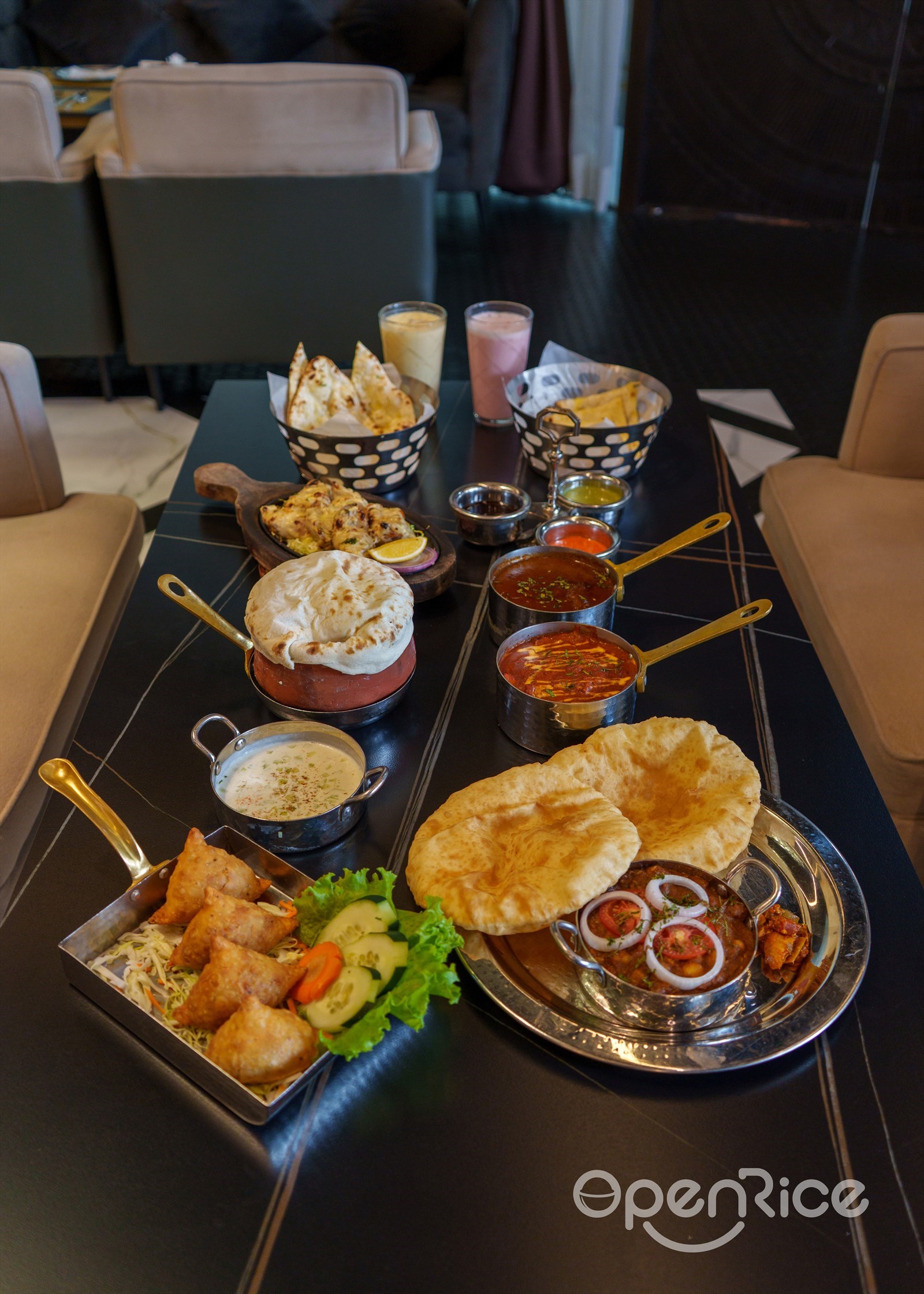Looking for an elegant Indian restaurant? Royal Indian Curry House (RICH) offers vibrant dining with authentic menu items made for sharing, such as a full bowl of tikka butter masala, a large plate of biryani, and various types of delicious lassis—a great spot to gather friends for a fun and delicious dining experience.