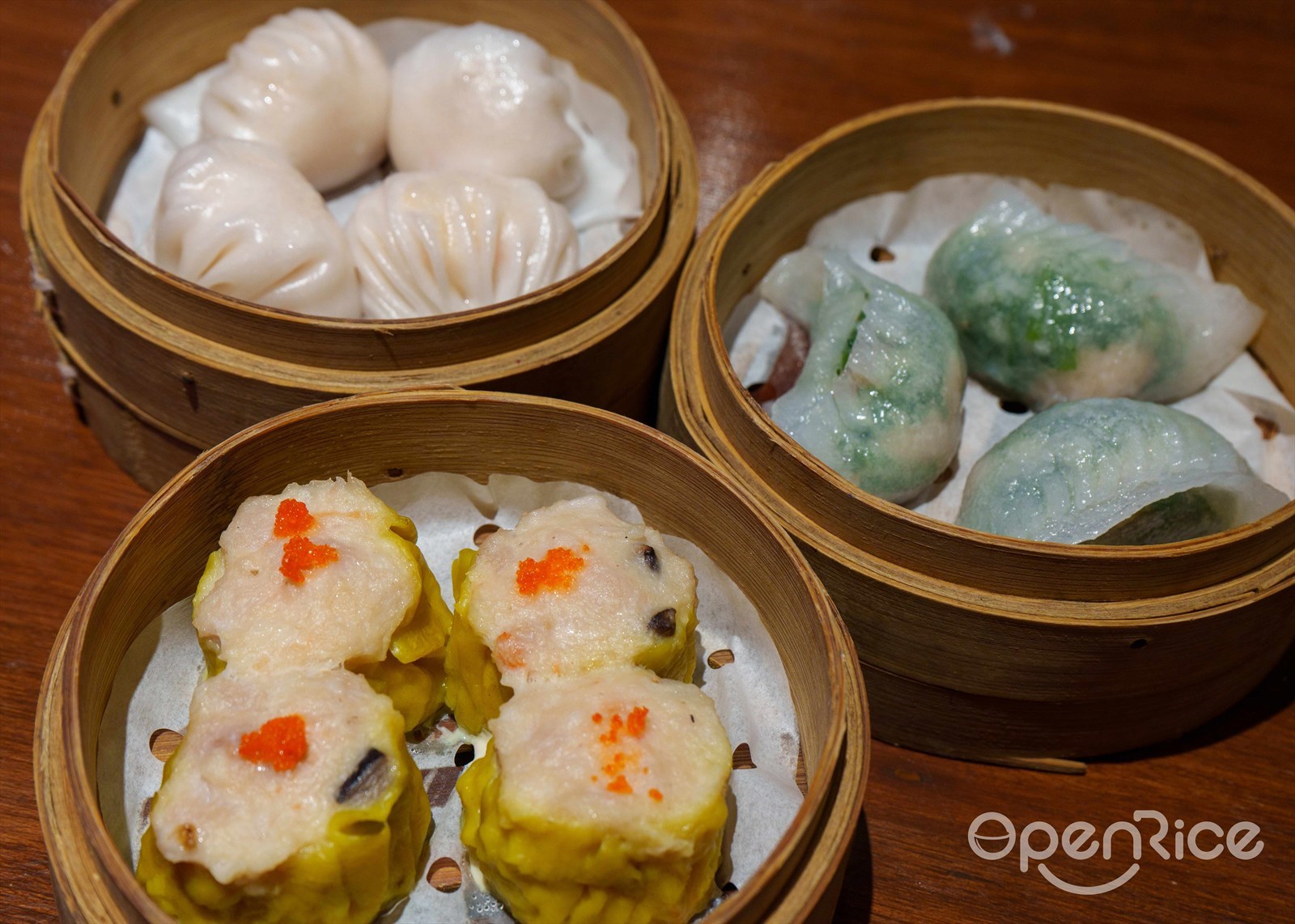 Open-topped steamed dumplings filled with seasoned shrimp and pork mixture, topped with crab roe. The filling is perfectly seasoned with just the right amount of bounce and flavor.