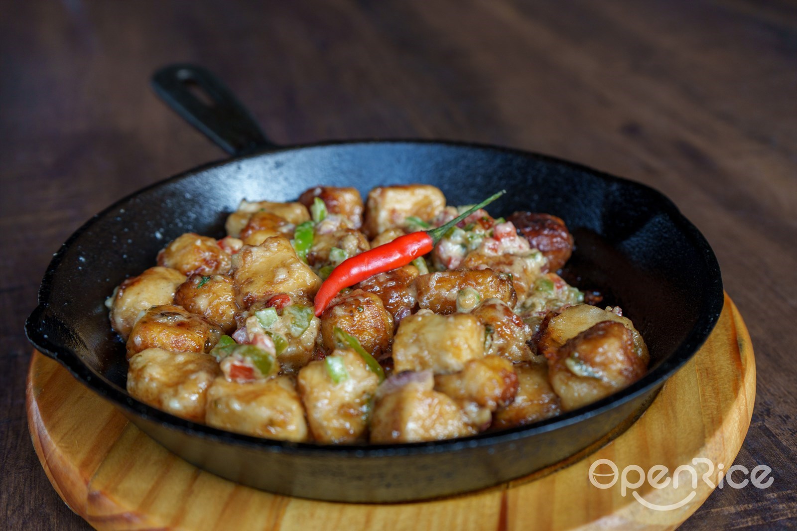 A Filipino favorite with a twist! Crispy tofu cubes stir-fried with bell peppers, red onions, and chili in a savory soy sauce, served on a sizzling plate that adds both aroma and excitement.