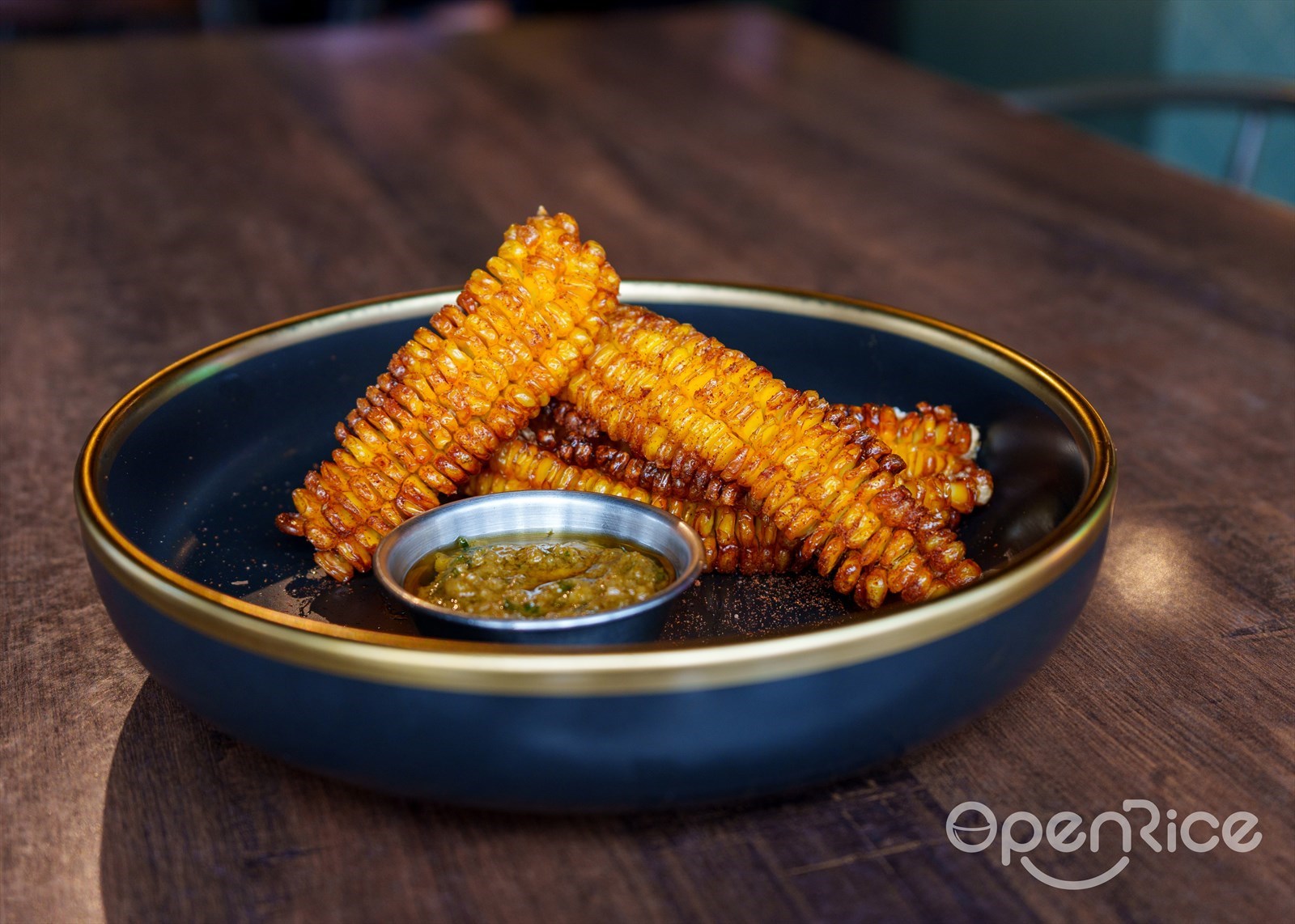 A fun and crunchy snack, these corn ribs are seasoned just right and paired with a zesty chimichurri dip, making them a light yet flavorful option.