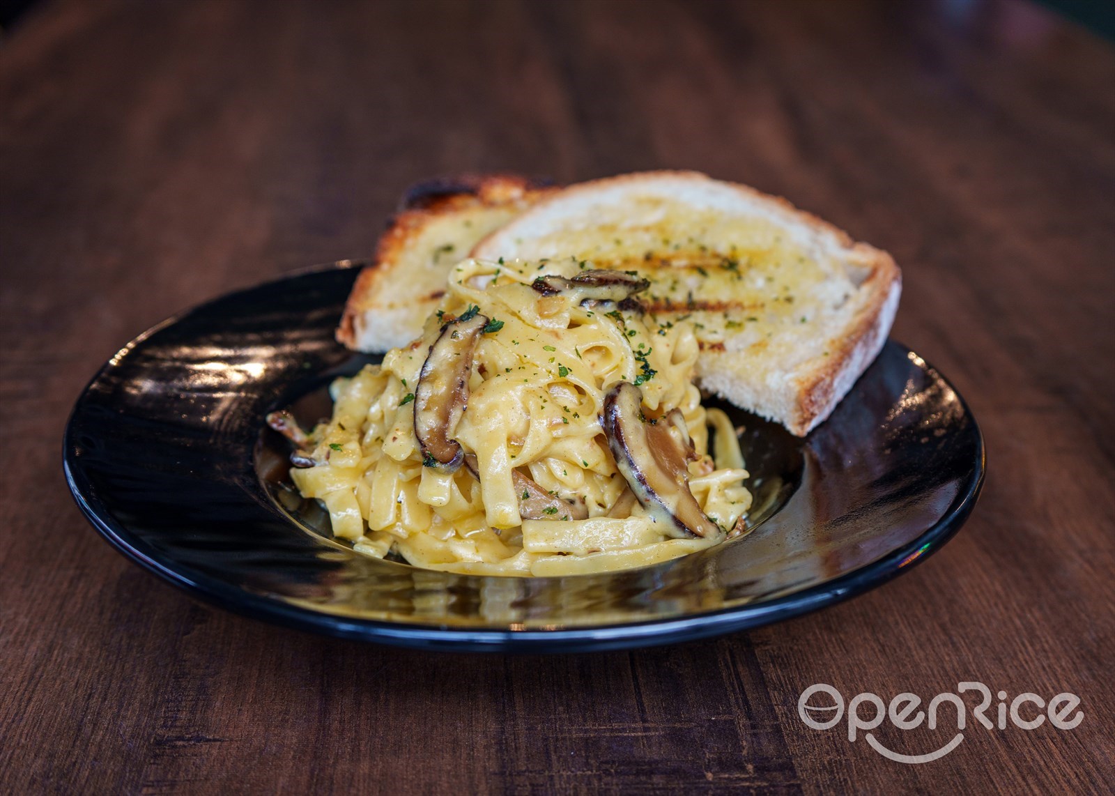 Creamy fettuccine tossed in aromatic truffle oil with sautéed mushrooms, served with garlic bread. Perfect for pasta lovers!