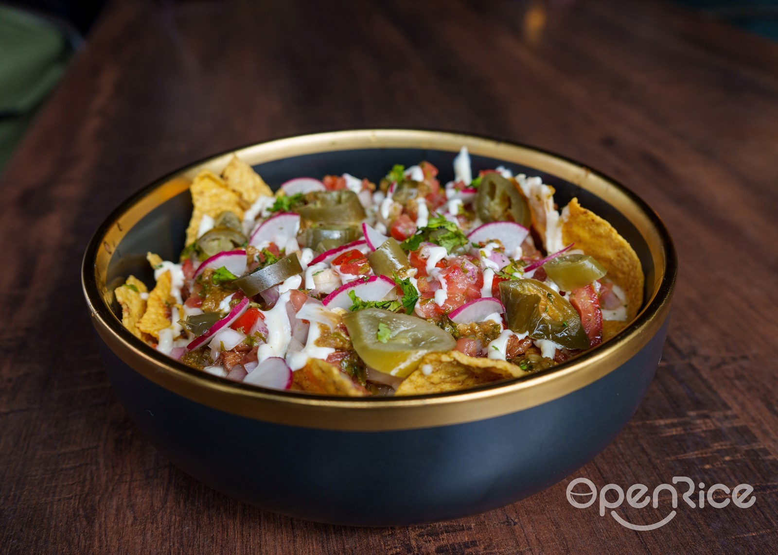 Loaded with pulled pork, jalapeños, salsa, sour cream, and chimichurri, this generous platter of crispy nachos is ideal for sharing with friends over conversations and cocktails.