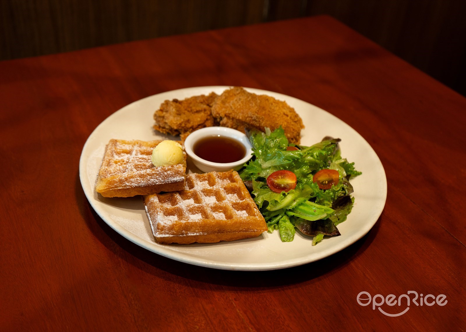The ultimate "why choose?" dish for indecisive souls everywhere. Crispy fried chicken meets fluffy waffles, with a side salad to make you feel slightly virtuous and maple syrup to abandon all pretense. It's comfort food that doesn't apologize for anything.