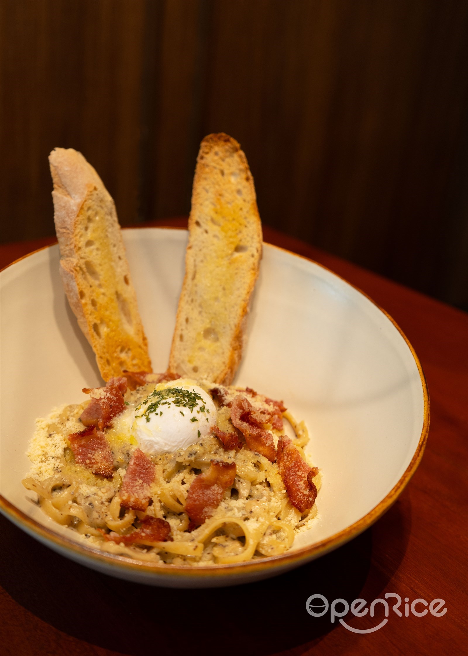 Elevated comfort food at its finest – truffle pasta with mushrooms, bacon, a perfectly poached egg, and parmesan cheese. Served with toasted baguette slices because carbs on carbs is a lifestyle choice we fully support.