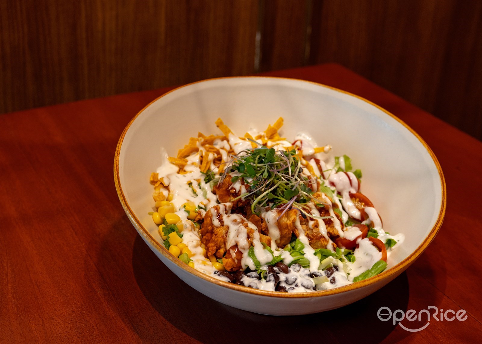 For when you want to eat healthy but still have fun doing it. Mixed greens get the party treatment with buttermilk chicken thigh poppers, sweet corn, black beans, nacho chips, cherry tomatoes, ranch dressing, and BBQ sauce. It's a salad that actually satisfies.