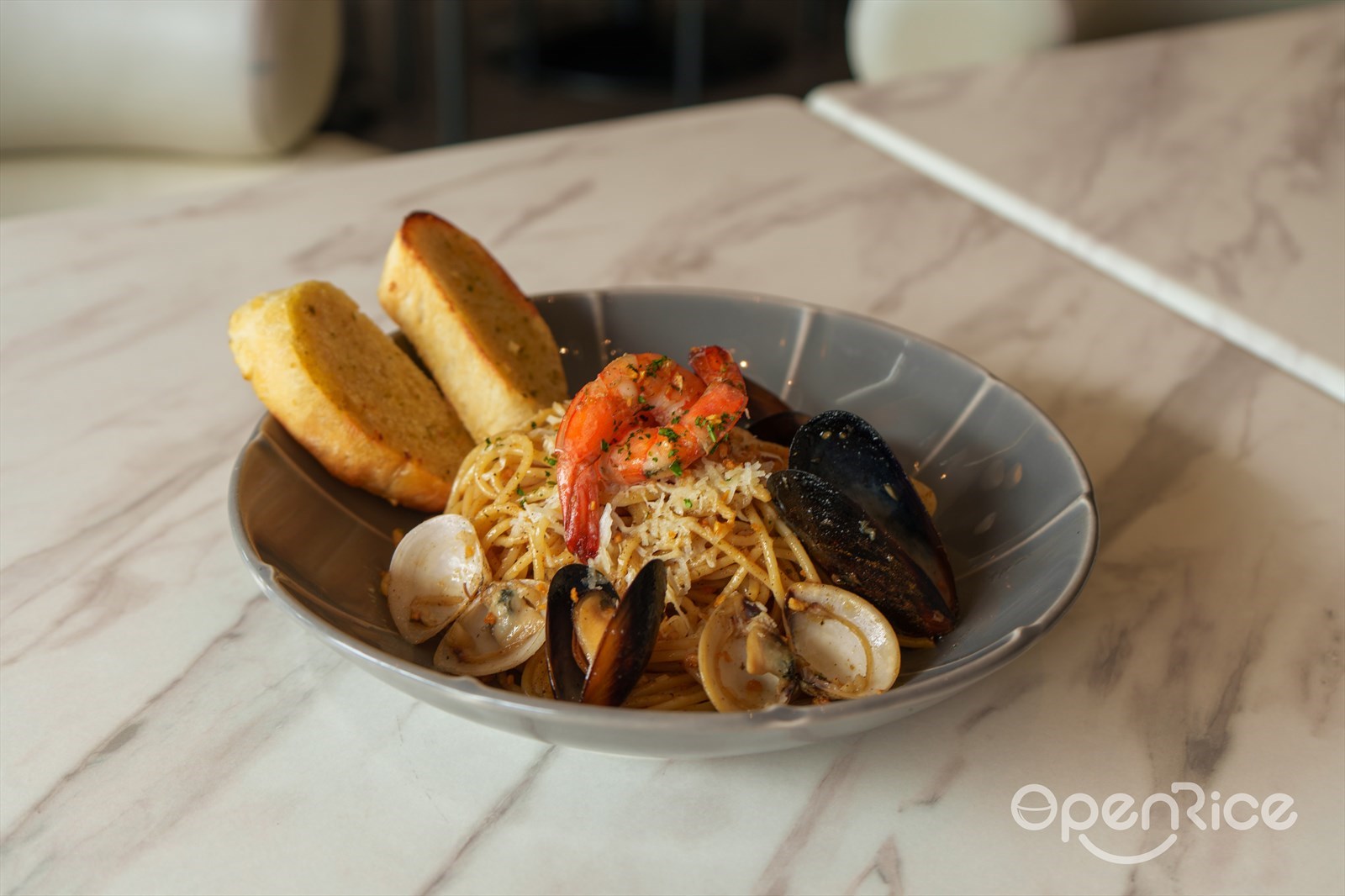 The Seafood Aglio Olio rounds out the menu nicely. This restaurant not only serves great steaks, but they also offer seafood options such as this pasta.