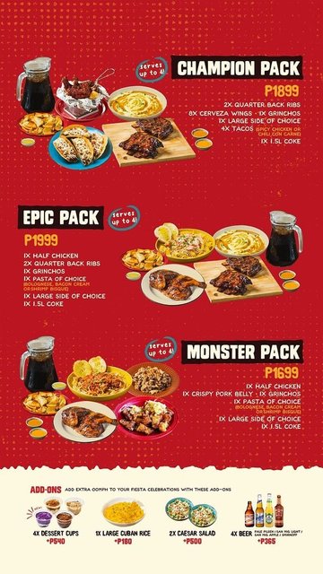 Quarter Chicken Southern Blend / Smokehouse BBQ Ribs / Quarter Chicken Lemon Herb / Salmon Cajun Cream Fusilli / Crispy Battered Lapu-Lapu With Smashed Potatoes / Lemon Marinated Grilled Salmon With Mashed Potatoes